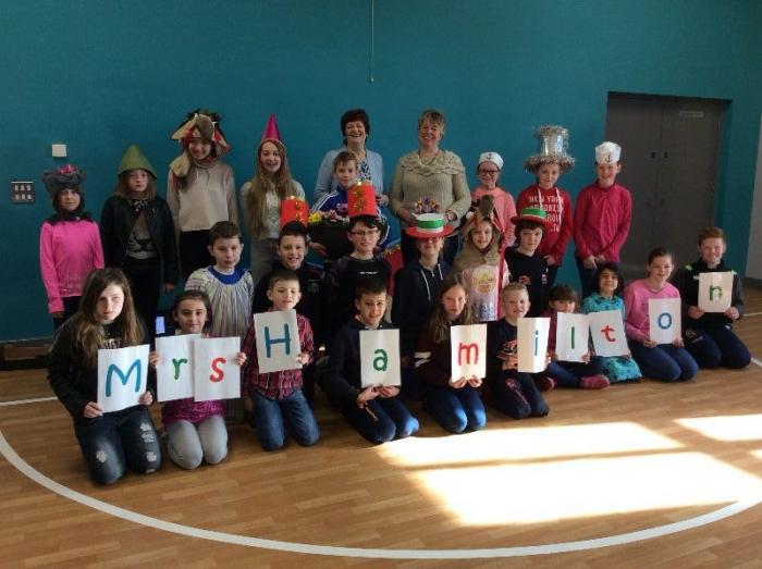 On Wednesday 28th March we bid farewell to Mrs Hamilton after over 16 years in Clare Primary School working as an assistant. In a special assembly Mrs Briggs spoke of all Mrs Hamilton’s work and skills, a number of children said a special acrostic poem all about Mrs Hamilton. We even had a parade of ‘Easter Bonnets’ from Primary Seven in honour of all the wonderful costumes Mrs Hamilton has created over the years for our plays and productions. Mrs Hamilton was presented with a number of gifts and we wish her well for the future.